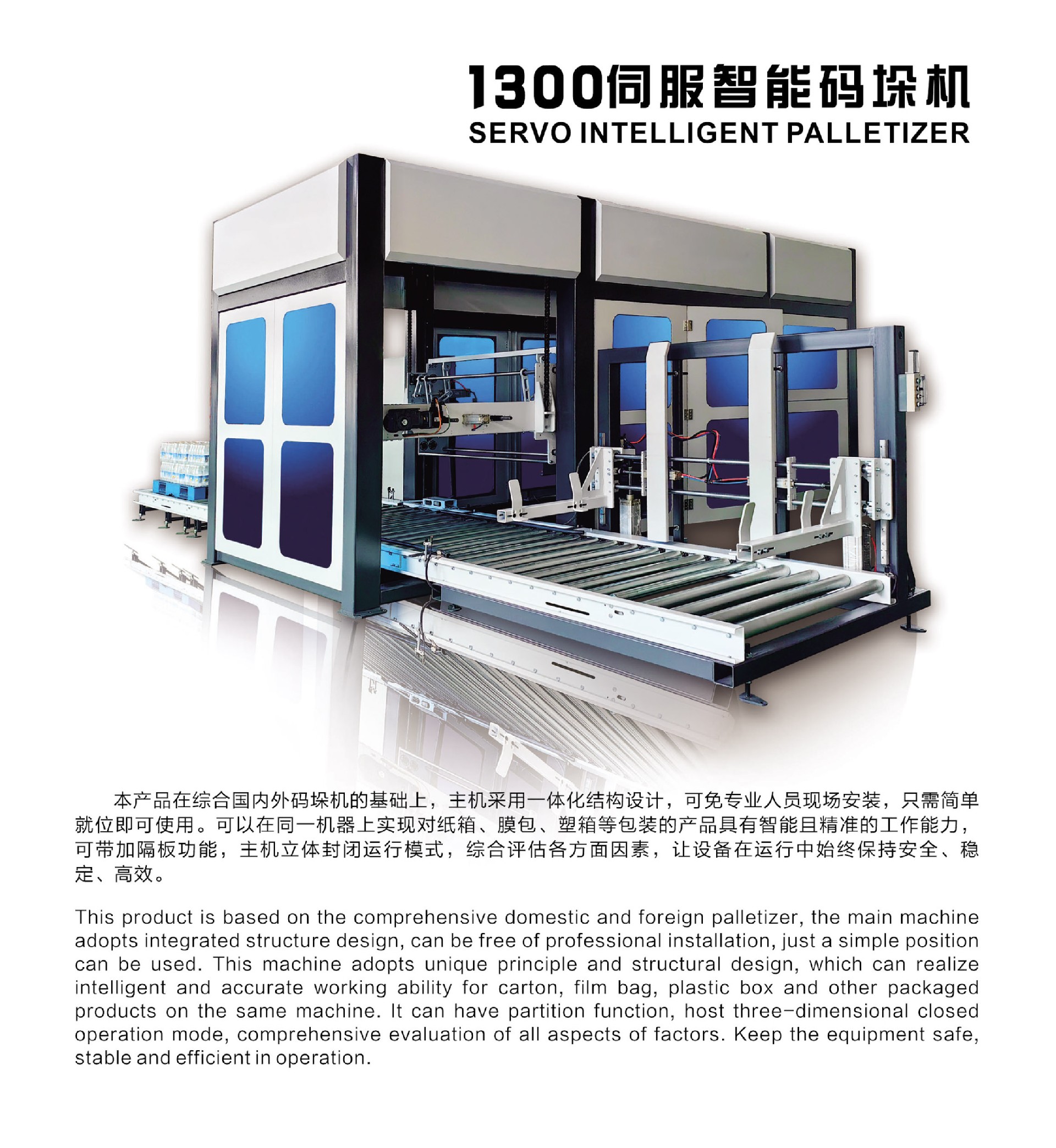 本設備主要是將已經裝好產品的紙箱,按一定排列方式碼在托盤上,進行自動推碼,可堆碼多層,便于又車運送至倉庫存儲。由PLC實現智能化操作,減少人工,提高速度。